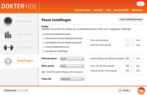 - Meldingen volgens het profiel dat je zelf kiest om even te ontspannen of je computerwerk af te wisselen met beweging.