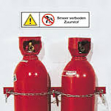 - Zorg voor ventilatie op de buitenlucht of voor mechanische ventilatie van opstelruimtes waarin zich gascilinders bevinden die brandbare, vergiftige, verstikking veroorzakende of zuurstofverrijkende gassen bevatten. Voorzie deze ruimtes aan de buitenzijde bij de toegangen van een gevaarsymbool met de juiste ondertekst. Voorbeelden hiervan zijn ‘brandbare gassen roken en open vuur verboden’, ‘vergiftige, bedwelmende, verstikking veroorzakende gassen’ of ‘zuurstofverrijkende gassen roken en open vuur verboden’.
