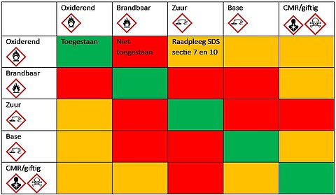 De vuistregel is dat alleen soort bij soort mag worden opgeslagen, tenzij in sectie 7.2 of 10 van het SDS staat dat dit geen probleem is.