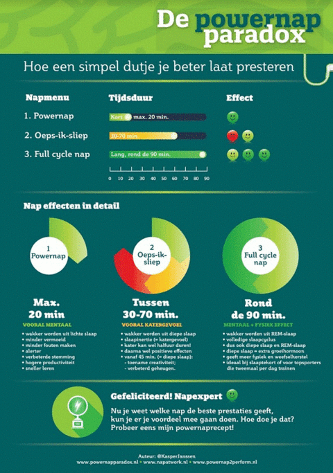 - Maak goede afspraken met je collega’s wanneer je een powernap het beste kunt plannen en wat te doen bij calamiteiten. Sociale steun van je collega’s en leidinggevende zijn belangrijk om te kunnen powernappen.